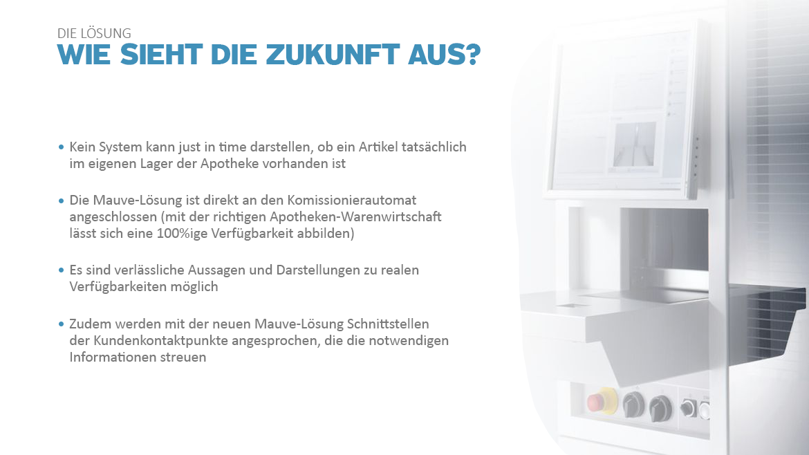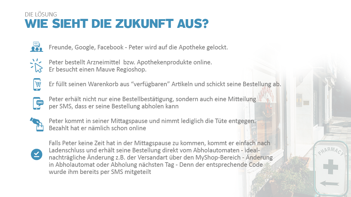 Mit der „An-alles-gedacht-Lösung“ von Mauve ist Ihre Apotheke blitzschnell im Netz. Steigern Sie Ihren Offizin-Umsatz in der digitalen Welt und senken Ihre Transaktionskosten in der Apotheke durch den automatischen Bestands.- und Preisabgleich. Parallel dazu werden die Aufträge direkt an Ihr Apothekensystem übermittelt. Bieten auch Sie Ihren Kunden eine echte Alternative zu den großen Onlineapotheken. Denn Sie sind viel schneller. Wo starten wir gemeinsam?