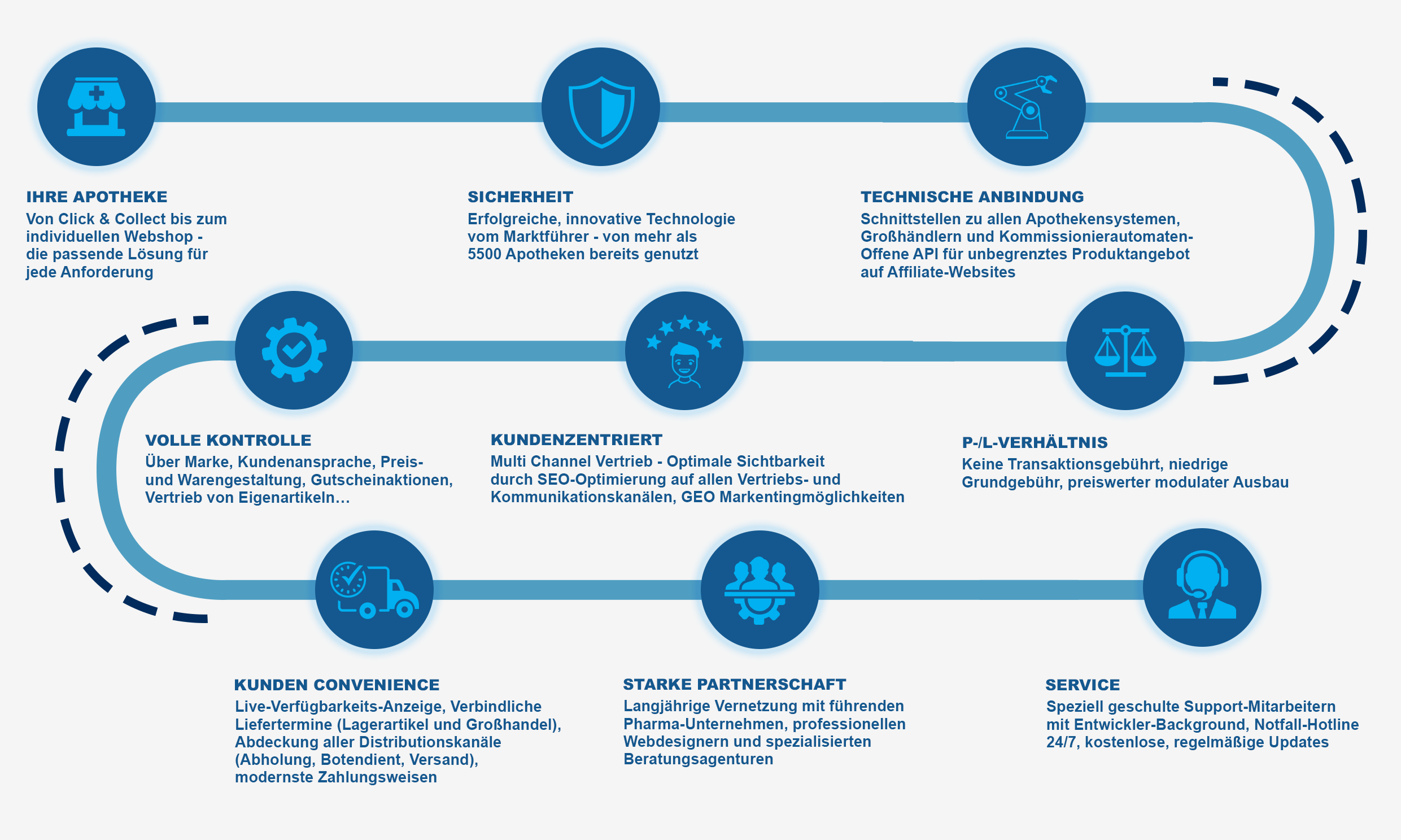 Insellösungen sind von gestern. Daher haben wir das Thema Click & Collect zum Überthema schlecht hin gemacht. Und das bedeutet, dass wir eine Lösung entwickelt haben, die in Ihre Prozesse in der Offizin, vollständig integriert ist. Dafür haben wir Anbindungen in mehreren Bereichen geschaffen, die die "Onlinebestellung" direkt in Ihr Kassensystem führt. Lassen Sie sich beraten und wir zeigen Ihnen die intelligenten Lösungen für Ihre Apotheke.
