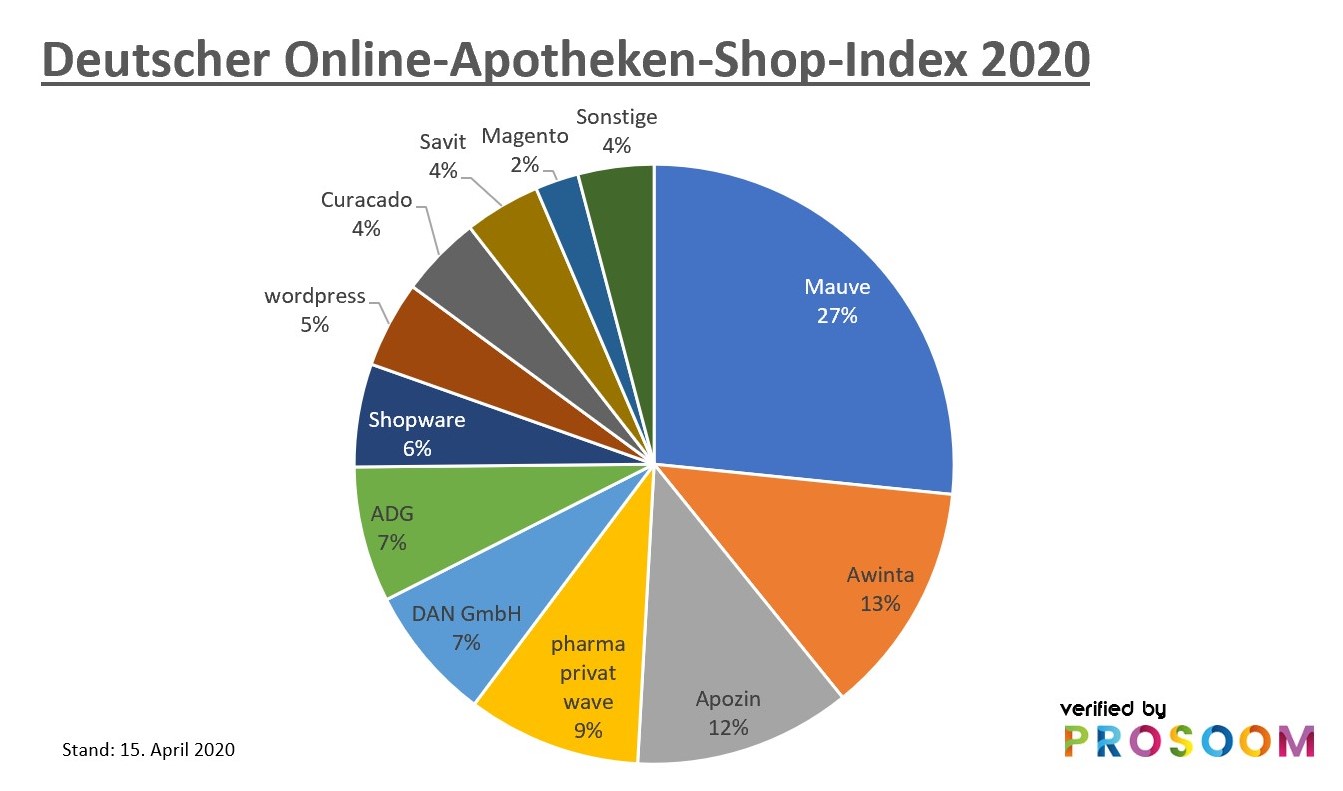 Mauve ist Marktführer im Bereich Shop-Systeme für Apotheken mit einem Marktanteil von 27 Prozent. Die dahinterliegenden Plätze gehen an Awinta und Apozin, gefolgt mit Abstand von pharma privat wave, DAN GmbH und ADG (PIN). Zu diesem Ergebnis kommt der Deutsche Online-Apotheken-Shop-Index 2020, der von der Prosoom GmbH im April 2020 erstellt wurde.