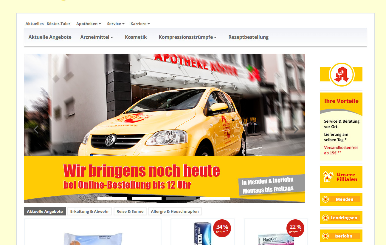 Auch standardisierte ApoShops müssen nicht auf ein ansprechendes Design und ein Schuss Individualität verzichten. Wie das geht, zeigt die Apotheke Köster, die erweiterte CMS Elemente benutzt. Eines dieser Elemente ist der Slider auf der Startseite, der saison- und situationsbedingte Produkte und Informationen liefert.