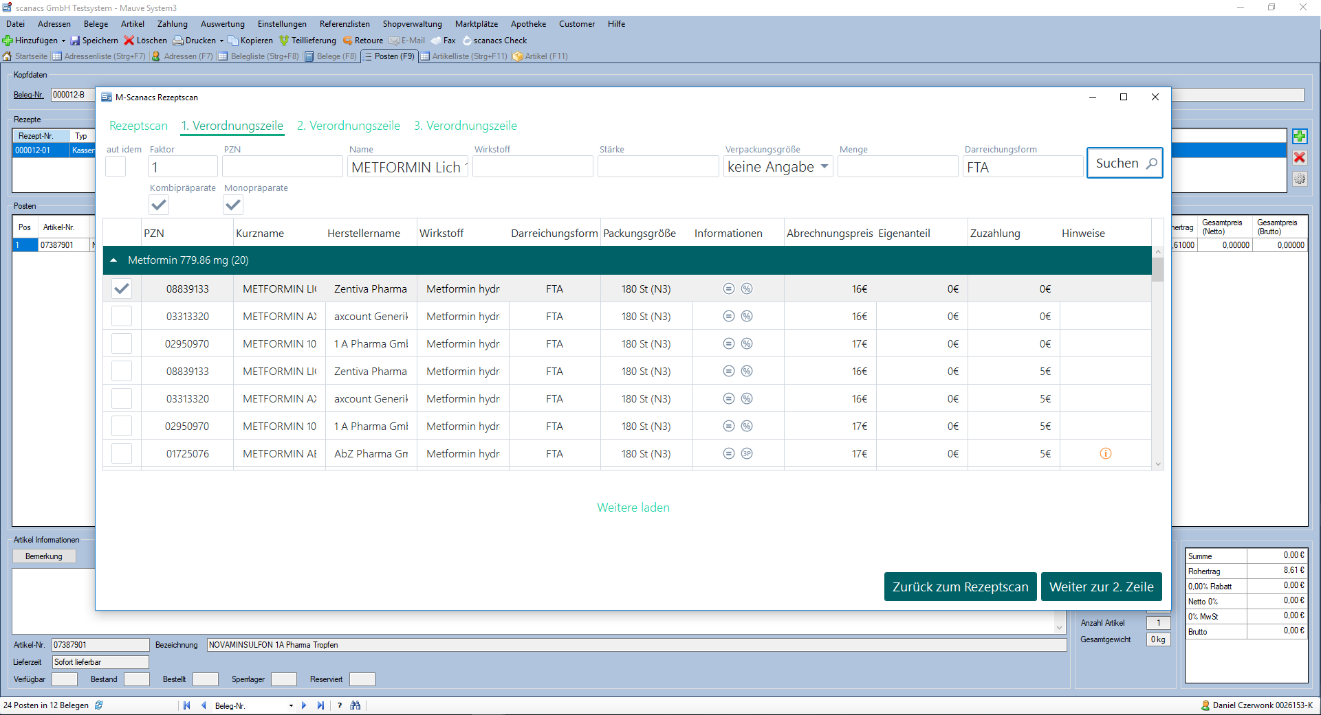 Über ein von Mauve entwickeltes Front-End für die Anwendung hat der Apotheker ohne Medien- bzw. Applikationsbruch die Möglichkeit, die vertraute Oberfläche des Mauve System3 für die Durchführung der Verordnungs- und Zuzahlungsprüfung zu benutzen. Nach dem Einscannen des Rezepts erfolgt automatisch der Datenaustausch mit scanacs zwecks Verordnungsprüfung. Dabei werden dem Apotheker über das Mauve System3 alle notwendigen Informationen im Rahmen der Verordnungs- und Zuzahlungsprüfung zur Verfügung gestellt und Austauschartikel gemäß Rabattvertrag der jeweiligen Krankenkasse angezeigt.
